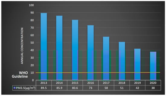 PM2.5 annual concentration of China’s air from 2013 to 2020.