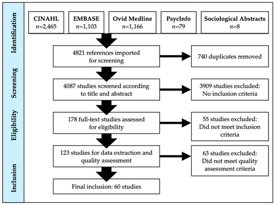 The results of the literature searches are outlined in Figure 1 (English) and Figure 2 (Chinese). Of the 4821 English-language references imported to Covidence for screening, 740 duplicates were removed. After abstract and title screening, 178 studies were subsequently selected to undergo full-text screening. About one-third (n = 55) of the articles did not meet the inclusion criteria. The number of studies that underwent quality assessment was 123 and slightly more than 50% were excluded as they provided too limited information pertaining to the research questions. A total of 60 English-language articles underwent extraction.