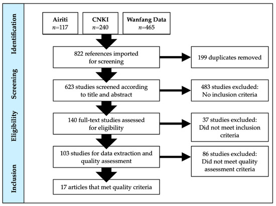 For the Chinese-language literature search, a total of 822 titles and abstracts (Airiti Library n = 117; CNKI n = 240; Wanfang Data = 465) were located. Of these, 199 were duplicates. The 623 unique titles and abstracts were independently screened by two reviewers. When there was disagreement regarding inclusion/exclusion between two reviewers, a senior researcher (K.D., S.L.) reviewed the title and abstract and made the final decision. 140 full texts warranted full-text review, and 17 studies met the inclusion criteria and were included in the study.
