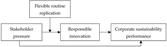 Stakeholder theory provides a theoretical basis for integrating business and social domain research [14]. Stakeholders provide resources and support for the long-term sustainability of enterprises and at the same time require enterprises to actively respond to the value proposition of the stakeholders [15]. Given that stakeholder rewards and penalties for sustainable performance will threaten the survival and growth of enterprises, enterprises are increasingly focusing on sustainability activities and devoting more resources to developing strategies, policies and practices that are consistent with sustainability and social responsibility goals in response to stakeholder pressure [16,17]. As a deliberative innovation mode in which stakeholders are included in innovation activities, responsible innovation can meet both economic benefits and sustainable development goals [7], and its innovation process and results will be affected by the value demands of stakeholders. It can be seen that there is an obvious logical relationship between stakeholder pressure and responsible innovation. Therefore, this study considers the role of stakeholder pressure on responsible innovation from a stakeholder perspective and then explores the impact of adopting this innovation model on the sustainable performance of enterprises. Furthermore, the ability of enterprises to effectively organize, search and reconstruct knowledge to match and meet the needs of responsible innovation also have a significant impact on corporate innovation effectiveness and sustainability performance [18]. Flexible routine replication, which relies on exploration capability, emphasizes more on the dynamic capability of enterprises, and can help enterprises break the old knowledge coupling, generate new knowledge combinations and create value [19]. Therefore, flexible routine replication is a new means for enterprises to create and solve problems [20], which is helpful for enterprises to acquire diversified knowledge to solve the problem of value co-creation between stakeholders and enterprises. This study also explores the moderating role of flexible routine replication in these influence paths.