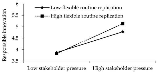 M4 includes the interaction term between stakeholder pressure and flexible routine replication in the regression equation with responsible innovation as the dependent variable, and the interaction term is significant (β = 0.098, p < 0.05), indicating that flexible routine replication plays a moderating role between stakeholder pressure and responsible innovation. This study further verified the moderating effect by dividing the data into two groups, high and low, by adding and subtracting one standard deviation from the mean value of flexible routine replication, which is shown in Figure 2. The results show that the higher the level of flexible routine replication, the stronger the effect of stakeholder pressure on responsible innovation. Therefore, flexible routine replication plays a positive moderating role between stakeholder pressure and responsible innovation. Therefore, H3 is supported.
