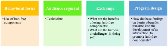 At the core of social marketing is the idea that individuals will implement something new (this being the adoption of a new behavior or abandoning a habit) if they perceive that the benefits gained are higher than the barriers they must overcome. This concept, also called “consumer exchange”, is both context- and user-specific [,,,]. For this reason, a key pillar of social marketing is the need to segment and understand the audience. The social marketing approach has implications for program development and implementation: an intervention is not likely to be successful if it is not designed with the user in mind (i.e., it provides clear benefits to its audience). In this respect, it is essential to dig deeper into why a certain behavior is not being adopted by conducting primary data collection with the population of interest. In this study, the behavior of interest, or behavioral focus, was the use of lead-free components for the installation and repair of pitcher pumps. With the pump technicians as the priority population, the intervention design focuses on midstream actors rather than the end-consumer []. The goal was to inform the development of an intervention to encourage behavior change by leveraging the perceived benefits of abandoning the use of Pb, or by decreasing the challenges of doing so.