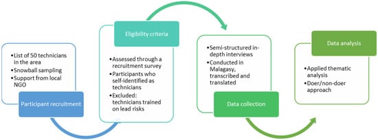 Technicians were identified using purposive sampling []. An initial list of technicians operating in the area of Toamasina was used to recruit potential participants based on our previous work there (M. Usowicz, personal communication, 28 June 2019) []. Using a snowball sampling, each participant was also asked to refer other technicians, or refer the research team to local hardware stores where technicians obtain materials. There is no available estimate for the technician population in Toamasina; therefore, the sample size needed could not be determined and recruitment was guided by the concept of theoretical saturation. A sample size of 10–15 is usually sufficient to achieve theoretical saturation for most marketing domains (e.g., perceived benefits and barriers, responsiveness to a proposed behavior change) [,].