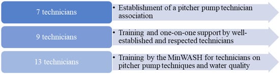 In WASH, social marketing has been applied to promote conservation of resources, energy, and water through campaigns such as WaterSense by the Environmental Protection Agency (EPA) Partnership Program, an initiative focused on making water savings easy for consumers []. A review by Evans et al. (2014) analyzed how social marketing has been used within the context of water and sanitation products, particularly in relation to handwashing, point-of-use water treatment, safe water systems, and latrine adoption. The authors found consistent improvement on behavioral mediators and, in many cases, positive behavior change []. Most of the studies identified had focused on promoting change at the household level, while only a few focused on midstream segments. For example, an intervention by CARE, an international global health organization, in southern Kenya focused their efforts on nurses undergoing training as the target audience for a program to improve handwashing []. To the best of our knowledge, no study has applied social marketing to promote behavior change among midstream actors (i.e., service personnel such as pump technicians) who can influence and support individual-level behavior change. Considered enactors, pump technicians are directly involved in and influence the behavior-change process [,].