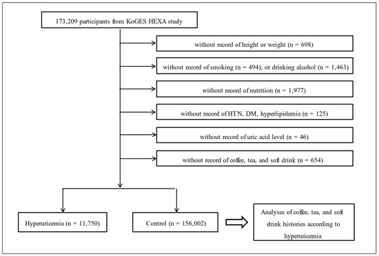 Of 173,209 participants, we excluded participants with missing data on height or weight (n = 698); smoking history (n = 494); alcohol drinking habits (n = 1463); nutritional status (n = 1977); history of hypertension, diabetes mellitus, or hyperlipidemia (n = 125); serum uric acid levels (n = 46); coffee, green tea, or soft drink intake (n = 654). The final sample included 11,750 and 156,002 participants with hyperuricemia and non-hyperuricemia controls, respectively (Figure 1). The frequency of coffee, green tea, and soft drink consumption was investigated.