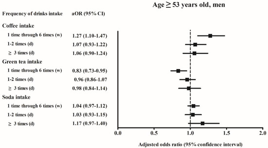 Among men aged < 53 years who consumed soft drinks ≥ 3 times per day, the adjusted OR of hyperuricemia was 1.26 (95% CI, 1.08–1.48, p = 0.004) compared to the reference group of “never”. Among women aged ≥ 53 years who consumed soft drinks ≥ 3 times per day, the adjusted OR of hyperuricemia was 1.37 (95% CI, 1.10–1.70, p = 0.005) compared to the reference group of “never” (Figure 2, Figure 3, Figure 4 and Figure 5).