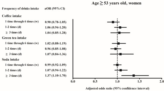 The adjusted odds ratio of the hyperuricemia according to the frequency of coffee/green tea/soda (soft drink) intake in the age ≥ 53 years old women. Fully-adjusted model (age, BMI, income, past medical histories, smoking, alcohol consumption, nutritional intake, frequency of coffee, green tea, and soft drink intake) was used.