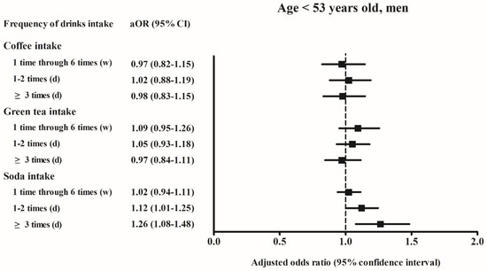 The adjusted odds ratio of the hyperuricemia according to the frequency of coffee/green tea/soda (soft drink) intake in the age < 53 years-old men. Fully-adjusted model (age, BMI, income, past medical histories, smoking, alcohol consumption, nutritional intake, frequency of coffee, green tea, and soft drink intake) was used.