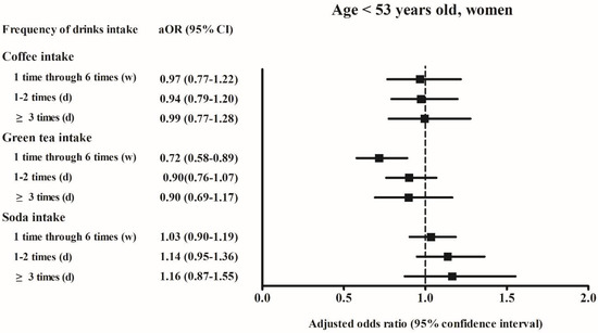 The adjusted odds ratio of the hyperuricemia according to the frequency of coffee/green tea/soda (soft drink) intake in the age < 53 years old women. Fully-adjusted model (age, BMI, income, past medical histories, smoking, alcohol consumption, nutritional intake, frequency of coffee, green tea, and soft drink intake) was used.