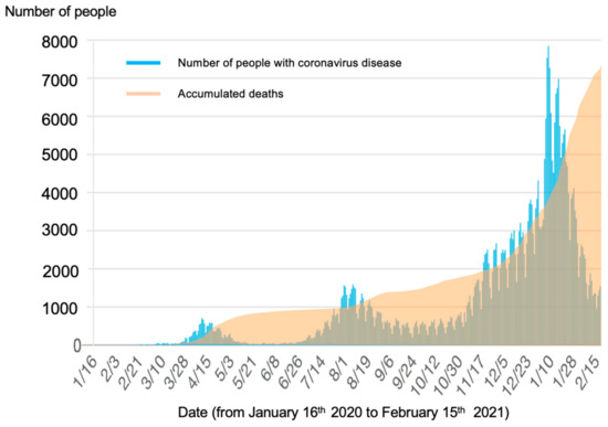 - Ministry of Health and Welfare. The Number of Infected Person with SARS-CoV-2 in Japan. Ministry of Health and Welfare. Available online: https://www.mhlw.go.jp/stf/covid-19/kokunainohasseijoukyou.html#h2_1 (accessed on 31 December 2020).