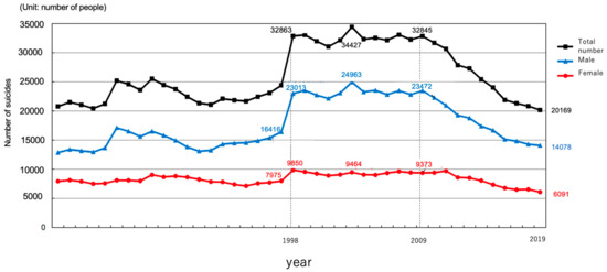 - National Police Agency. The Number of Suicide Based on the Statistics of the National Police Agency. Available online: https://www.npa.go.jp/safetylife/seianki/jisatsu/R03/R02_jisatuno_joukyou.pdf (accessed on 1 February 2021).