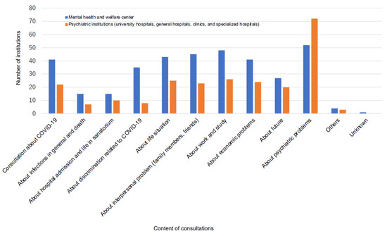 To our knowledge, this is the first survey in Japan that examined the status of mental health care related to COVID-19, using a questionnaire survey of mental health and psychiatric institutions. The results showed that public mental health institutions, called “mental health and welfare centers,” are playing a central role in providing mental health consultation. All 55 mental health and welfare centers located in the prefectures and government-designated cities in Japan provide telephone consultation. The mean number of consultations per institution during the 10 months was 236, and the total number of consultations exceeded 12,000. On the other hand, the number of telephone consultations was small in psychiatric institutions (including psychiatric departments of general and university hospitals, private psychiatric hospitals, and psychiatric clinics); however, 90% or more of the psychiatric institutions that were consulted provided face-to-face consultations or examinations. One reason for this may be that consulters requiring treatment visited the medical institutions personally. Another reason for more face-to-face consultation via psychiatric institutions could be their relatively more serious cases.