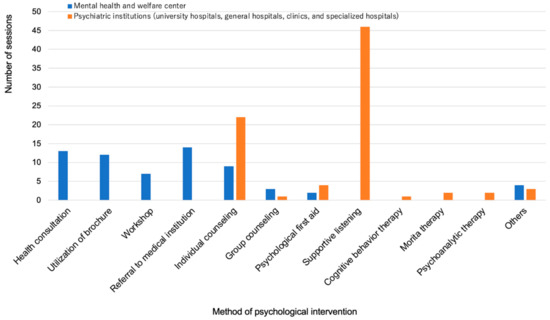 Psychological intervention was provided in approximately 40% and 70% of MH and PU institutions, respectively, that were consulted. Although the number of sessions and intervention duration varied among MH institutions, approximately 30% of interventions consisting of 10 sessions or more or lasting for 3 months or more occurred in MH institutions, suggesting that they spent much time and effort in practice. In psychiatric institutions, the most common methods of intervention were interviewing and counseling. In MH institutions, the methods of intervention varied, including health consultation, utilization of brochures, holding workshops, individual counseling, and referral to medical institutions.