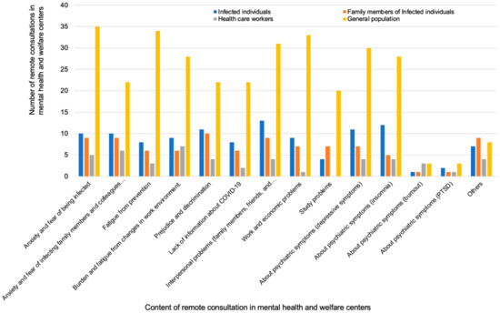 In the MH and PU groups, remote consultation was performed in 42 (79%) of 53 and 17 (20%) of 84 institutions, respectively. In the MH group, the categories of consulters were patients (74%), family members (69%), and local residents (79%, with the highest number of consultations). In the PU group, most consultations were by patients or family members. Of note, consultations were also made by staff in general and university hospitals, although the number was small. The most frequent methods of publication of remote consultation in the MH group were via the homepage (86%), by public relations magazines (52%), and posters (43%). The contents of consultation varied. The consultations made by the patients of the MH group were mostly about interpersonal problems (with family members, friends, and colleagues; 65%), mental symptoms (depressive symptoms; 55%), prejudice and discrimination (55%), anxiety and fear of being infected (50%), and anxiety and fear of infecting family members and colleagues (50%). The number of consultations according to the category of consulter in mental health and welfare centers are shown in Figure 8.