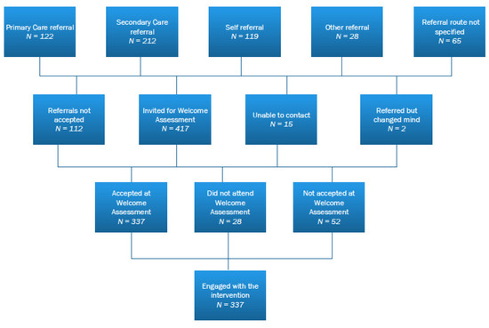 - Saini, C.; Hanlon, B.; Harrison, T. James’ Place Internal Evaluation: One-Year Report. 2020. Available online: https://www.jamesplace.org.uk/wp-content/uploads/2020/10/James-Place-One-Year-Evaluation-Report-Final-20.10.2020.pdf (accessed on 1 March 2021).
