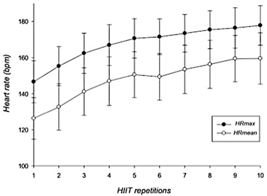 Dynamics of maximal and mean heart rates during HIIT intervention. Error bars represent standard deviations. HRmax = maximal heart rate; HRmean = mean heart rate; bpm = beats per minute; HIIT = high-intensity interval training. n = 25.