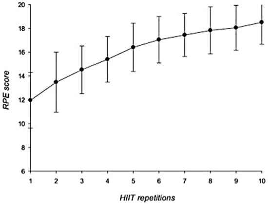RPE scores during HIIT intervention. Error bars represent standard deviations. RPE = rates of perceived exertion; HIIT = high-intensity interval training. n = 25.