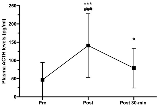 Plasma ACTH concentrations (pg/mL) measured pre-, immediately after (post), and 30-min post HIIT (post 30-min). Error bars represent standard deviations. * p < 0.05 and *** p < 0.001 compared to pre-HIIT; ### p < 0.001 compared to post 30-min. n = 25.