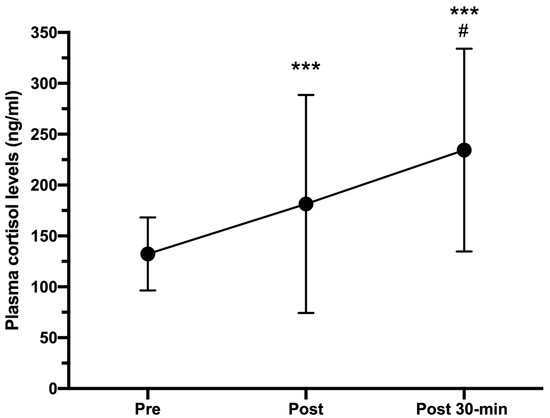Plasma cortisol concentrations (ng/mL) measured pre-, immediately after (post), and 30-min post HIIT (post 30-min). Error bars represent standard deviations. *** p < 0.001 compared to pre-HIIT values; # p < 0.05 compared to post-HIIT values. n = 25.