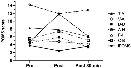 According with previous studies [43,44] and as we also expected, the 30-min recovery period after HIIT induced decreases in negative mood dimensions of POMS, increasing, consequently, the iPOMS score until reaching pre-exercise levels. Although our pilot study was not mainly focused on the effects of such recovery period on subjects’ ability to recover themselves after intense exercise, data regarding vigor, but especially fatigue, after exercise could serve as indicators of psychophysiological recovery status. Future studies should examine the feasibility of using these POMS dimensions to determine the efficacy of different recovery strategies after high-intensity exercise.