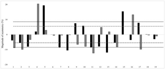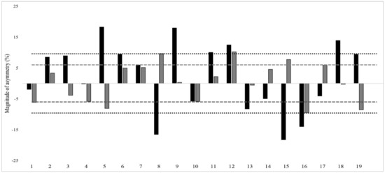 Further, meaningful asymmetries were found in our study. It is possible that these findings may relate to the age of the swimmers (10–15 years), who are still in their growth and developmental stages. Similar meaningful asymmetries were observed in male youth handball players aged 16 years (i.e., SLCMJ and SLSLJ asymmetry = 11.2 ± 8.4% and 8.3 ± 7.5%, respectively) and basketball athletes aged 18 years (SLCMJ asymmetry = 10.6 ± 8.6%) [8,22]. The asymmetry scores for individual athletes in SLCMJ and SLSLJ tests are presented in Figure 1 and Figure 2, with dotted lines indicating the CV for each test. The relevance of this CV for each test is that when asymmetry scores surpass the CV, the imbalances are greater than the test variability and can be considered to be real [1,37]. The individual asymmetry scores were greater than the CV among 15 swimmers and 19 swimmers in SLCMJ and SLSLJ, respectively. Therefore, ≤50% of the swimmers had real inter-limb differences during unilateral jump testing. Further studies may consider investigating how such results are modified as athletes mature and their interaction with training.