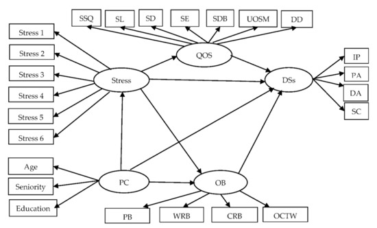 In addition to demographic data, five latent variables (personal characteristics, stress, quality of sleep, occupational burnout, and depressive symptoms) were included in our hypothesized model.
