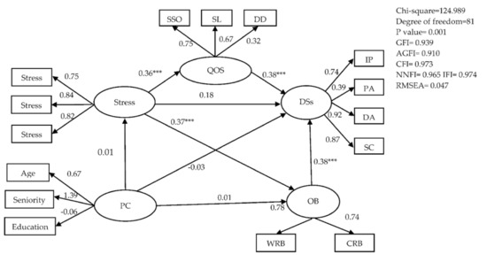A good fit for our model was obtained with χ2 = 124.989, degree of freedom = 81, p = 0.001, normed chi square = 1.543, GFI = 0.939, AGFI = 0.910, CFI = 0.973, NNFI = 0.965, IFI = 0.974, and RMSEA = 0.047. The structural relationships with standardized coefficients are presented in Figure 2. We used the Sobel test to examine indirect effects in a structural equation model (SEM). This showed a mediating effect of quality of sleep for the relationship between stress and depressive symptoms (z = 2.931, p = 0.001), and another mediating effect of occupational burnout for the relationship between stress and depressive symptoms (z = 3.285, p = 0.001), indicating that PW nurses’ quality of sleep and occupational burnout were significant determinants of depressive symptoms. The path from stress to depressive symptoms was significant (z = 1.755, p = 0.081), indicating that PW nurses’ stress was a significant determinant of depressive symptoms. The standardized total effect of stress affected depressive symptoms through the mediating roles of quality of sleep and occupational burnout (z = 3.125, p < 0.001) (Table 1). In the final model, stress, quality of sleep, and occupational burnout explained 46.0% of variance in PW nurses’ depressive symptoms (Figure 2).
