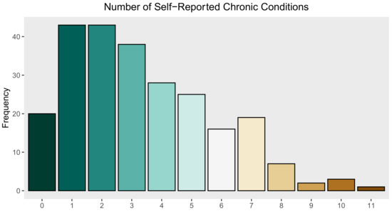 Frequency distribution of number of self-reported health conditions among n = 246 unsheltered PEH in Nashville, TN.