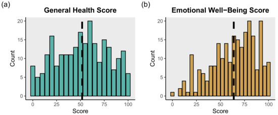 (a) General health and (b) Emotional well-being scores among n = 246 unsheltered PEH in Nashville, TN as measured by the SF-36. Dashed lines indicate mean scores.