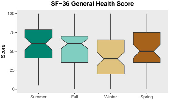 The regression models examining associations between seasonality, sociodemographic characteristics, environmental exposure, social network factors, and chronic health conditions and SF-36 general health scores are presented in Table 7. These models produced four key findings. First, as shown in Model 1, seasonality as a fixed effect alone accounted for 79% of the variance in general health scores, suggesting a strong seasonal trend in general health among unsheltered PEH. In Model 1, the fixed-effects coefficients represent the mean SF-36 general health scores for participants who were surveyed during the summer, fall, winter, and spring, respectively. Participants surveyed during the winter displayed the lowest mean general health score (44.4), while participants surveyed during the summer displayed the highest mean general health score (57.4). Boxplots of general health scores stratified by season are presented in Figure 3. Second, we found that unsheltered women displayed considerably lower general health scores than unsheltered men. In our final model (Model 4), we observed that being male was associated with an average 8.6-point increase in general health score (p ≤ 0.001). Third, the number of self-reported chronic health conditions was negatively associated with general health and reporting an additional chronic health condition was associated with an average 6.2-point decrease in general health score (p ≤ 0.001). Fourth, Model 4 suggests that spending just a single night inside during the past week displays a significantly positive association with general health among unsheltered PEH. Participants who spent just one night indoors during the past week reported general health scores that were, on average, 1.8-points higher than participants who spent no nights indoors during the past week (p ≤ 0.01).