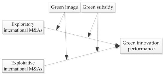 Against this background, this paper tries to answer the question of how green innovation can be conceived and realized from the aspect of international Mergers and Acquisitions (M&As), and empirically tests the impact of different international M&As strategies on green innovation. Theoretical research has divided international M&As into two types of exploration and exploitation, and emphasized the necessity of implementing both strategies [,,], to date, however, a few, if any, empirical studies have examined the innovation consequences and moderating conditions of exploratory and exploitative M&As overseas. We propose that exploratory and exploitative international M&As both are beneficial for green innovation. Exploratory international M&As can provide firms with novel and new knowledge beneficial for eco-design and process enhancement, while exploitative international M&As can help firms find the most cost-effective ways to develop green products. Except that, we argue that the effect of international M&As on green innovation can be best understood by focusing on different international M&As behaviors and the strategic, environmental context facing an organization. When firms pursue high green image and operate in a high green subsidy environment, they will choose to explore in foreign markets and obtain high green innovation performance. In contrast, when firms pursue low green image and operate in a low green subsidy environment, they will choose to exploit through international M&As and gain low green innovation performance. Through this richer explanation and empirical assessment, we contribute to a greater clarity and better understanding of how to implement green innovation and, perhaps more important, under what conditions firms pursue this type of innovation. Figure 1 presents our theoretical model of exploratory and exploitative M&As, and green innovation.