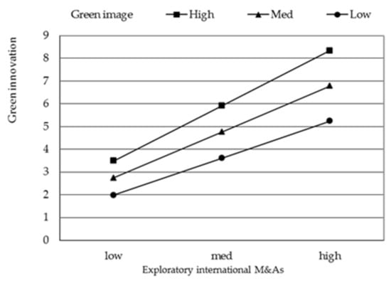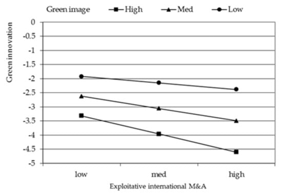 Corporate image refers to the desired general impression and evaluation of the firm in the minds of its key stakeholders, which can be established and adjusted through public relations and green innovation activities []. The establishment of green image is based on achieving the goal of sustainable development, with an emphasis on environmental protection and environmental commitments. A firm with high green image will pay great attention to environmental concerns and social benefits, focus on fulfilling corporate social responsibility, and invest a lot of resources for firm’s long-term development []. Existing research has proved that investment in getting high green image can help enhance consumer satisfaction and increase sales of green products and service, avoid the potential trouble of environmental protests and legal penalties [], which in turn enables firms to be more willing and capable to invest in related activities for realizing green innovation. This means that when firms pursue high green image, they are scheduled to guide resources to invest in conducting exploratory international M&As and leveraging the knowledge sourced for green innovation. In contrast, at this time, exploitative international M&As activities will not be supported by sufficient resources, which in turn will also result in the inability of firms to achieve good green innovation performance. However, when firms pursue low green image, they will guide resources to invest in general innovation related activities, then the implementation of exploratory international M&As and the transformation of novel knowledge explored overseas into green innovation both are difficult to conduct. In other words, pursuing low green image may hinder exploration-oriented firms from seeking novel knowledge to enhance green innovation. Under this condition, exploitative international M&As can be used to enhance green innovation performance because of its low resource requirements. Therefore, we propose that: