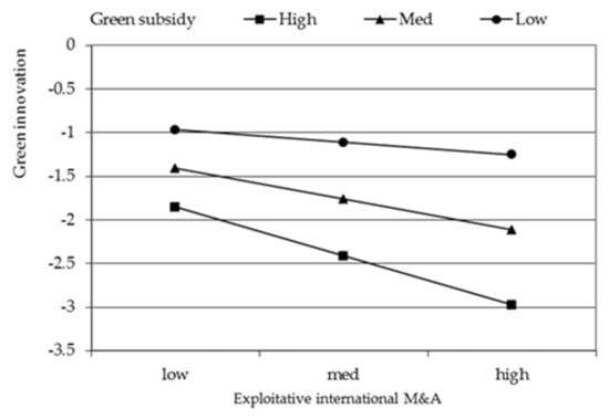 Green subsidy, also known as environmental subsidy, is a kind of an industrial policy provided by the government to protect the environment and natural resources, which is presented as such forms of payment of cash, tax incentives and exemptions, government environmental protection investments or government loans at preferential rates []. Due to the increasing environmental damage and “double externality effect,” governments of all countries adopt intervention policies to internalize environmental costs, subsidize the investment of domestic companies in governing the environment, and improving product processing technology and environmental protection equipment []. High green subsidy means firms can obtain a lot of financial support to conduct international M&As and seek enough novel knowledge for green innovation []. However, we argue that firms tend to explore foreign markets to boost green innovation when the government provides high green subsidy, as exploration can offer firms new, novel, and sophisticated knowledge for green innovation. High green subsidy can also enable international firms convert knowledge explored overseas into green innovation performance. In contrast, firms will just obtain average green benefits from foreign exploitation activities in a high green subsidy environment, because exploitation takes place in familiar knowledge areas which cannot play such a big role as exploratory international M&As in green innovation. It is worth noting that although exploratory international M&As provide firms with a lot of novel knowledge and information, it is a real high-risk challenge for them to devote or borrow enough resources to integrate the knowledge learned overseas. Therefore, when firms get low green subsidy in implementing green innovation, it is difficult for firms to explore overseas and the innovation effect of exploratory international M&As may be really limited, then it is wise for firms to conduct exploitative international M&As with low risk and resource investment, which enable them to make more efficient use of their existing resources and capabilities. Therefore, we propose that: