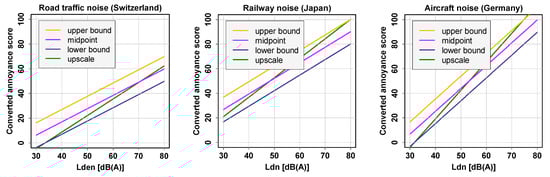Examples of linear regression lines resulting from modeling with four different scale conversions of the 5-point scale, as listed in Table 2: Left, road traffic noise in Switzerland (whole country) []; center, railway noise in Japan (Sapporo) []; right, aircraft noise in Germany (Frankfurt) [].