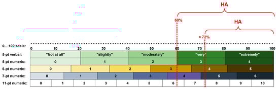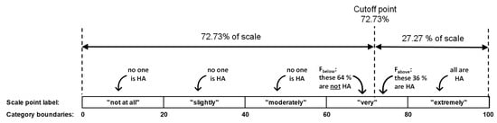 Cutoff point of 72.73% (which corresponds to the three uppermost scale points 8, 9, 10 on the 11-point scale) on the 5-point scale and assigned percentage of HA within the five categories “not at all,” “slightly,” “moderately,” “very,” “extremely.”