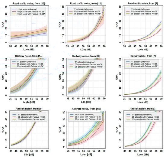 Exposure–response curves from different noise annoyance surveys showing %HA, as derived from the 11-point scale with cutoff point at 72.73% (“reference”), as well as based on the simulation with responses from the 5-point scale (with 95% confidence intervals as shaded areas). Two simulated curves are shown, one for Fabove = 0.36 and one for the empirically derived Fabove value of the respective study, marked with an asterisk (*). Curves are based on a simple unadjusted (crude) model. Data sources are from the following studies: [,,,,,,].
