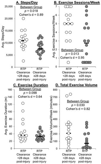Individual data points describing the exercise characteristics (A) average steps per day; (B) average exercise sessions per week; (C) average duration when exercising; (D) average total exercise volume per week. across the two weeks after study enrollment between those who received RTP clearance 28 days or greater post-injury compared to those who received RTP clearance in less than 28 days post-injury. Black bars represent the group mean.