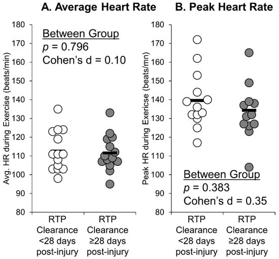 Individual data points describing the average (A) and peak (B) heart rate during exercise during the two weeks after study enrollment between those who received RTP clearance 28 days or greater post-injury compared to those who received RTP clearance in less than 28 days post-injury. Black bars represent the group mean.