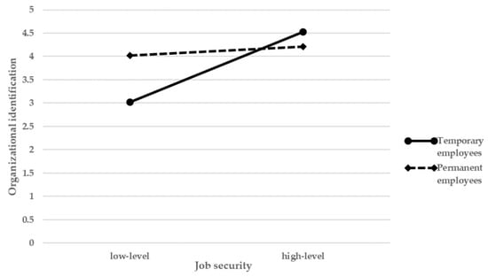 Hypothesis 3a predicted that employment type will moderate the relationship between job security and organizational identification. Table 4 demonstrates that the interaction of job security and employment type is negatively related to organizational identification (β = −0.35, p < 0.001), which supports hypothesis 3a. This further indicates that for permanent employees, the positive relationship between job security and organizational identification is weaker than for temporary employees.