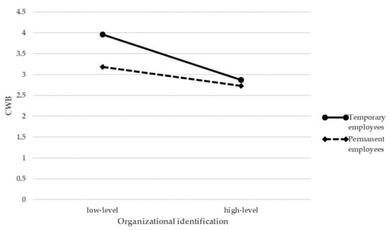 The results also show that the negative relationship between organizational identification and CWB is stronger for temporary employees than for permanent employees. This phenomenon may due to the fact that when temporary employees have a higher organizational identification, they may be more inclined to transform into a formal member of the organization. To achieve this goal, they will prevent themselves from conducting negative behavior. In addition, the avoidance to risk makes temporary employees more sensitive to the level of job security [], and more inclined to become a permanent employee in the organization. Therefore, Chinese cultural background of value stability also amplifies the moderating effect of employment status in the indirect relationship of job security and CWB via organizational identification [].