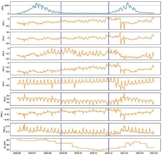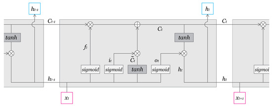 The chosen prediction model is a RNN with LSTM. This model architecture allows for multi-feature and multi-step predictions. Though standard RNNs are often used in time series prediction, the standard architecture suffers from the problem of vanishing gradients, which hinders the learning of long period relationships and patterns in data sequences. RNNs with LSTM solve the issue by deliberately adding long-term memory [19,20]. RNNs with LSTM have two memory cells, one for long-term memory and another for short-term memory to solve the problem. The equations below describe the LSTM RNN block. is responsible for long-term memory and for short-term memory. The introduction of the Forget gate vector, proposed by Felix A. Gers et al. in 1999, has also improved the accuracy of the prediction by allowing the adjustment of long-term memory [21]. More in detail, the Forget gate vector, , controls how much information is discarded from long-term memory, . The new long-term memory cell, , is created by adding information from the input gate vector, , and the new short-term memory cell, is decided by the output vector, and the long-term memory, (Figure 1, Figure 2 and Figure 3).