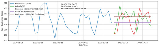 For the purpose of validation of this methodology, the prediction of and associated RMSE using the LSTM RNN model were compared to alternative more trivial methodologies. The first methodology chosen for the comparison is a naive forecast. A naive forecasting the context of a 14-day prediction is created by projecting the last actual value available forward for 14 days. Taking the naive forecast slightly further, the second methodology used for the comparison is a seasonal naive forecast. Which in this case creates a 14-day prediction that is equal to not just the last actual value, but the last 14 actual values. Usually, seasonal naive forecasts are performed using monthly, quarterly or yearly seasonality, but in the context of predicting , weekly seasonality is sometimes evident due to case data reporting patterns. These two more trivial methodologies for predicting are compared to the RNN LSTM methodology by choosing a prediction date in an interim period and comparing the RMSE over the prediction period. The RMSE results can be seen in Table 3 and a comparison of their predictions is shown in Figure 5.