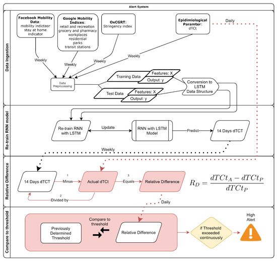 The following diagram (Figure 6) provides a graphical representation of the working of the alert system. Data channels and processes marked in red happen on a daily basis, whilst black data channels and all other processes happen weekly. The model is re-calibrated weekly and predictions are made weekly; however, relative difference values are obtained daily when the actual case data becomes available.