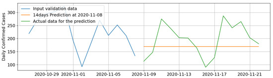 The output of the trained RNN model with LSTM is a 14-day prediction of new daily cases, . The first date of the 14-day prediction is a Monday. This Monday corresponds to 6 days earlier than the actual date that the model is run, this is due to the external constraints of data availability from each source. This means that the prediction will run only 7 days into the future from the date the prediction is done.