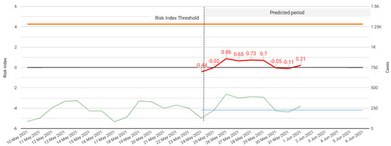 Below is a screenshot of the final output of our model for third wave surveillance available on the COVID-19 monitoring website. (COVID-19 monitoring website: https://www.covid19sa.org/riskindex-ai (accessed on 29 June 2021)) The model shown on the site is updated weekly and the relative difference value is calculated automatically as new daily case data becomes available (Figure 11). Notably, at the time of writing, the system has been successful in detecting the beginning of the third wave in the provinces in South Africa. South African policy makers engage with the created RIM on a weekly basis during the Gauteng government COVID-19 command council meetings.
