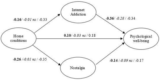 To contrast H1 and H2 an SEM was performed. The model fits the data well (χ2(48) = 232.72, GFI = 0.97, AGFI = 0.96, RMSEA = 0.05, TLI = 0.94, CFI = 0.95, NFI = 0.94, IFI = 0.95). As can be seen in Figure 1, home conditions related significantly and positively to PWB. This relationship was partially mediated by IA (which was negatively related to home conditions and PWB), and by nostalgia (which was also negatively related to home conditions and PWB).