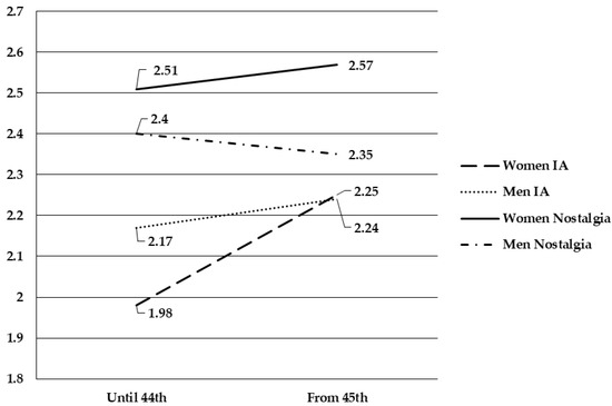 To contrast H5, 2 × 2 ANOVAs were conducted. As can be seen in Figure 2, the interaction effect is significant for both IA and nostalgia. As far as IA is concerned (F(1, 1509) = 7.57, p = 0.006, ŋ2 partial = 0.005), until the 44th day of confinement, men showed more levels of IA than women. From day 45th, the levels of addiction raised and were equal for both sexes, so women increased their levels of IA much more. In terms of nostalgia (F(1, 1509) = 3.68, p = 0.05, ŋ2 partial = 0.002), women scored higher in the two different time periods. There was a decrease in the levels for men and an increase for women from day 45.