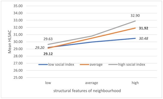 A significant interaction was also demonstrated between the social and structural characteristics of the environment and the level of the HLSAC index. In highly deprived areas, higher social capital does not improve HL levels. Only the accumulation of the positive impact of high levels of both environmental features is visible. Some studies indicate that in poor areas there may also be a high level of social bonds, which translates into the strengthening of selected health competences, such as self-efficacy [].