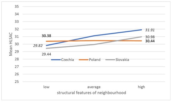 This proves that the abovementioned two types of environmental features have a cumulative protective effect. The second significant interaction concerns the comparison of the relationship with the structural features of the neighbourhood between the countries (Figure 2).