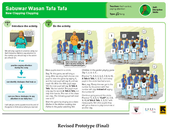 During the design workshops and rapid prototyping exercises, teachers were asked to rank the activities and tell us why and how they chose the activities they liked or understood the best. We also asked teachers to role-play the activities together without any background information, so we could understand what was immediately self-evident from the materials themselves, what assumptions teachers made, and what required additional clarification or support. Lastly, we asked teachers to try the materials in their classrooms with students, and local field staff conducted observations to determine what was engaging or challenging for students and teachers. The initial activity drafts included many complex components, various technical terms drawn from the literature on SEL, and stock photos to illustrate the activity steps (see Figure 1). During the design workshops, we learned that teachers found a large amount of text on the cards difficult to understand given varying levels of literacy and familiarity with English. Teacher rankings of the initial activities indicated that ease of comprehension and ease of use were the most important reasons for ranking an activity highly. Teachers valued activities that were simple and short, used familiar words, and were easy to understand, explain, and play. Additionally, teachers leaned heavily on the photos to support their comprehension of the activity, and images were often interpreted literally. This meant that photos needed to depict specific activity steps accurately; otherwise, teachers might implement the activity incorrectly. As we learned more about local needs, we revised the activity card prototype iteratively (see Figure 1). For example, we minimized the text and provided targeted guidance exclusively on areas that teachers requested (for example, a theory of change that explains exactly how students will practice the target skill and what behavioral outcomes teachers can expect). We simplified adaptation guidance into a bulleted list of tips and organized the card structure into three simple steps that are repeated across all activities. The photos on each card were replaced with locally designed illustrations that reflect Northeast Nigerian teachers and students performing specific aspects of the activity. Additionally, framing workshops allowed us to source words that reflect how teachers in Northeast Nigeria value and talk about SEL skills, and that terminology is included across the cards.